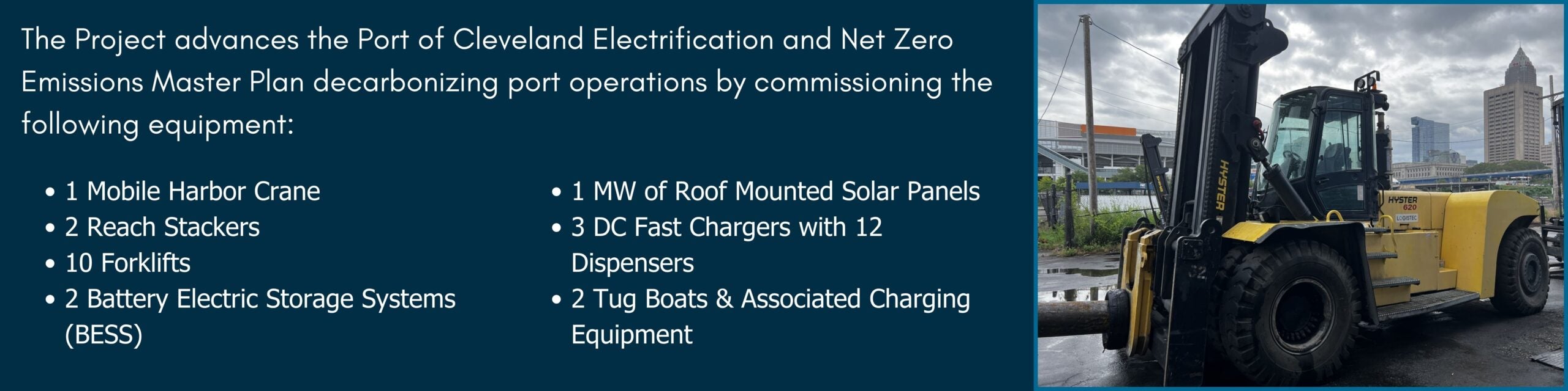 Logistec, the Port of Cleveland’s operator, and Great Lakes Towing were partners to the application and sub award agreements are being developed. Cleveland Public Power (CPP) is an implementation partner.